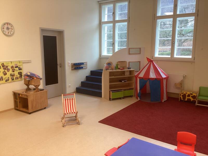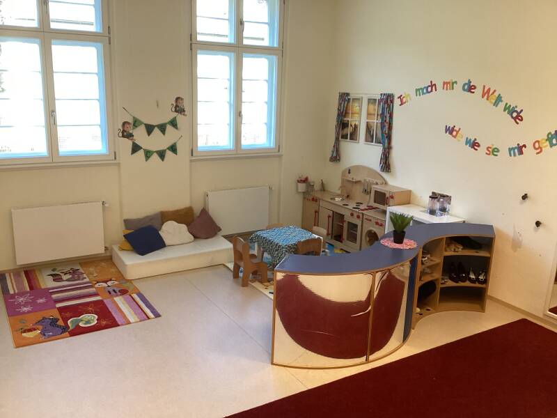 Die Krippe dient als Bildungsraum und Rückzugsort für alle Kinder unter 2 Jahren. Der Raum enthält eine Kuschelecke mit Lesemöglichkeiten, ein Baubereich, einen Sensorik-Tisch, einen Kaufladen, eine Spielküche, sowie einen Bereich, der zum Frühstücken, Malen, Kneten und Basteln zur Verfügung steht.