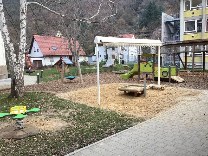 Die Zeit, die die Kinder im Außengelände verbringen, kann für das freie Spiel genutzt werden. Hierfür stehen den Kindern ein Sandkasten, eine Matschanlage, verschiedene Spielhäuser, eine Vogelnestschaukel, unterschiedliche Fahrzeuge sowie eine Hangrutsche zur Verfügung.