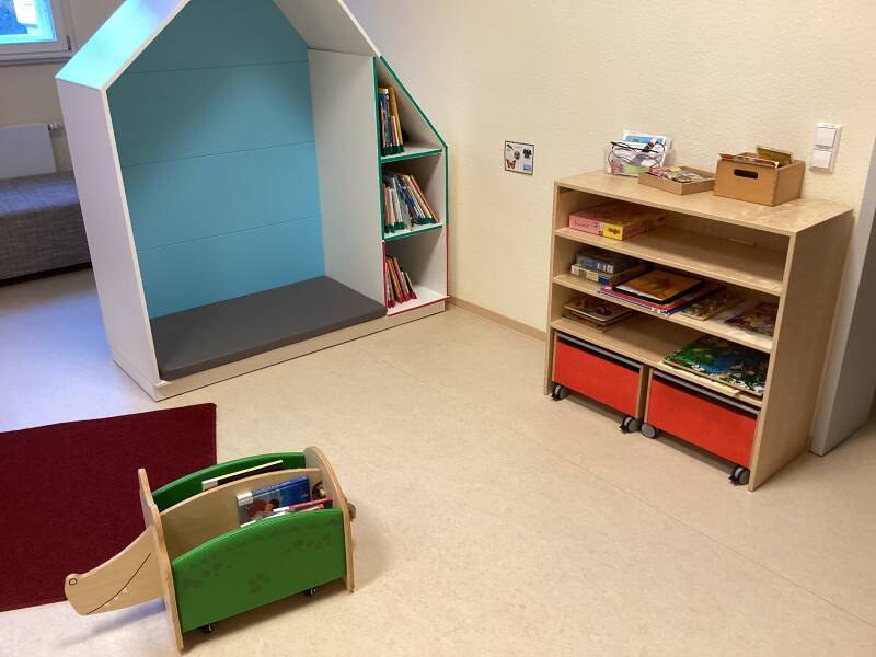 Bücher zu unterschiedlichen Themen ermöglichen den Kindern einen vielseitigen Blick auf die Welt. Hierfür laden zwei Lesehäuschen und Kuschelbereiche zum Eintauchen in unterschiedliche Bereiche ein.